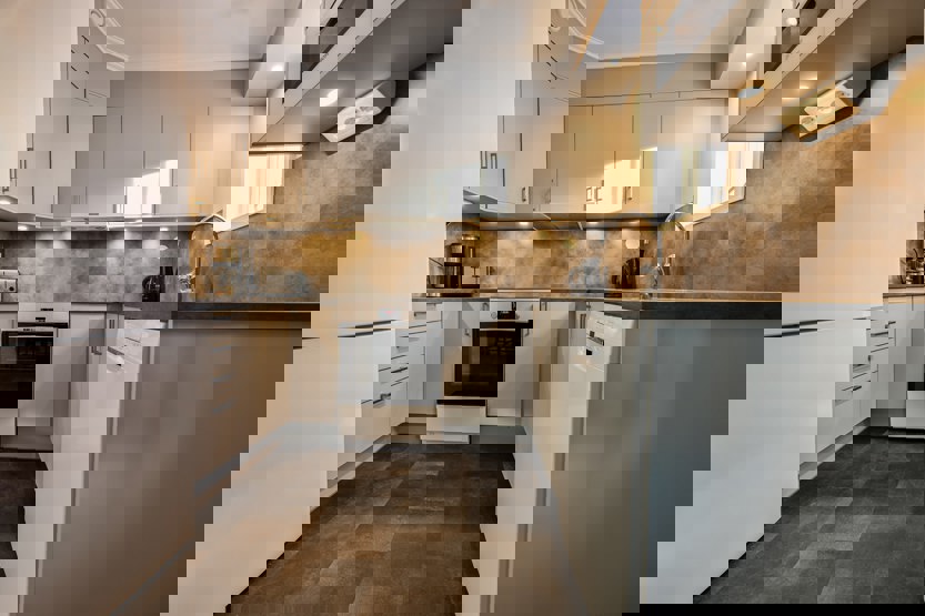 Køkkenet indeholder: elkomfur med ovn, køleskab, frys, opvaskemaskine, microovn.