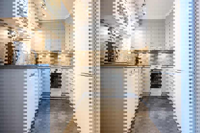 Køkkenet indeholder: elkomfur med ovn, køleskab, frys, opvaskemaskine, microovn.