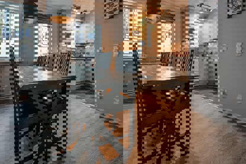 Køkkenet indeholder: elkomfur med ovn, køleskab, frys, opvaskemaskine, microovn.