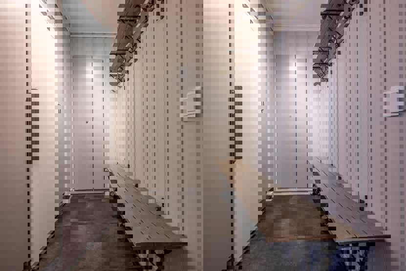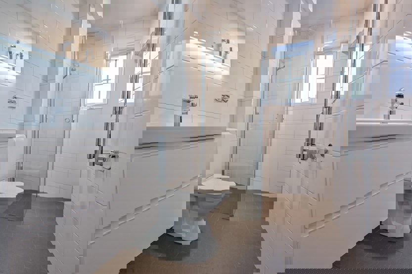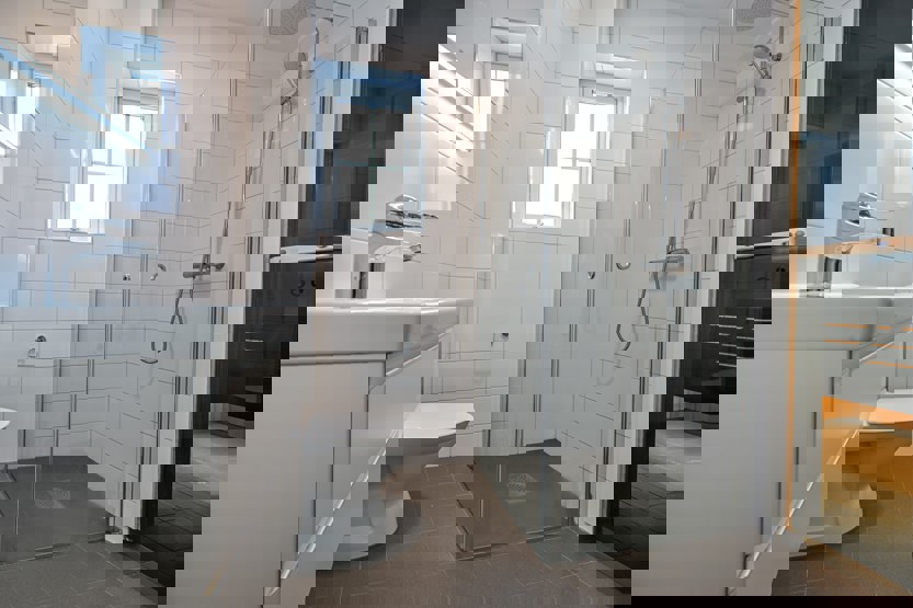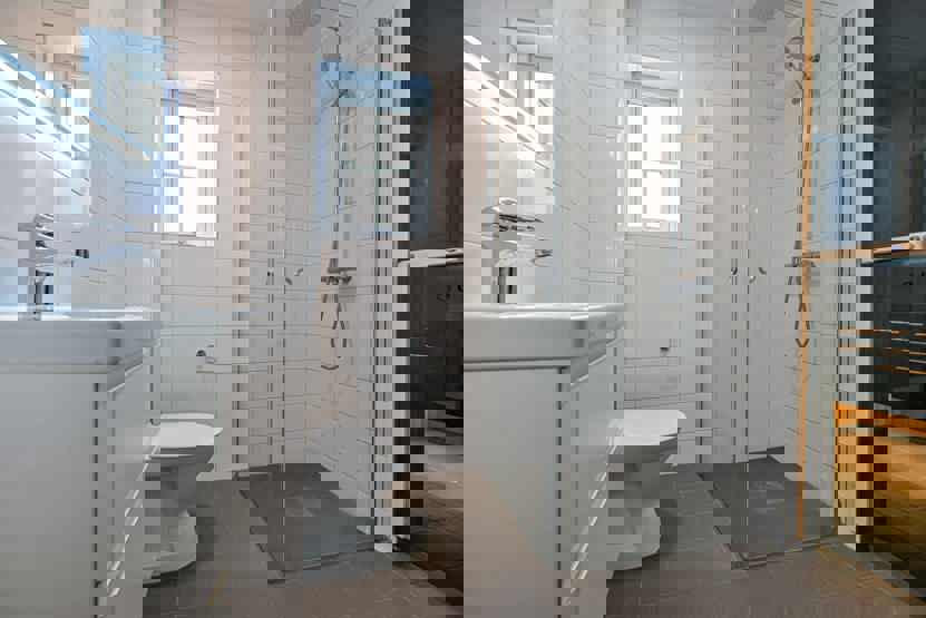 Badeværelset-1 = bruse/wc/sauna. Badeværelset-2 = bruse/wc.