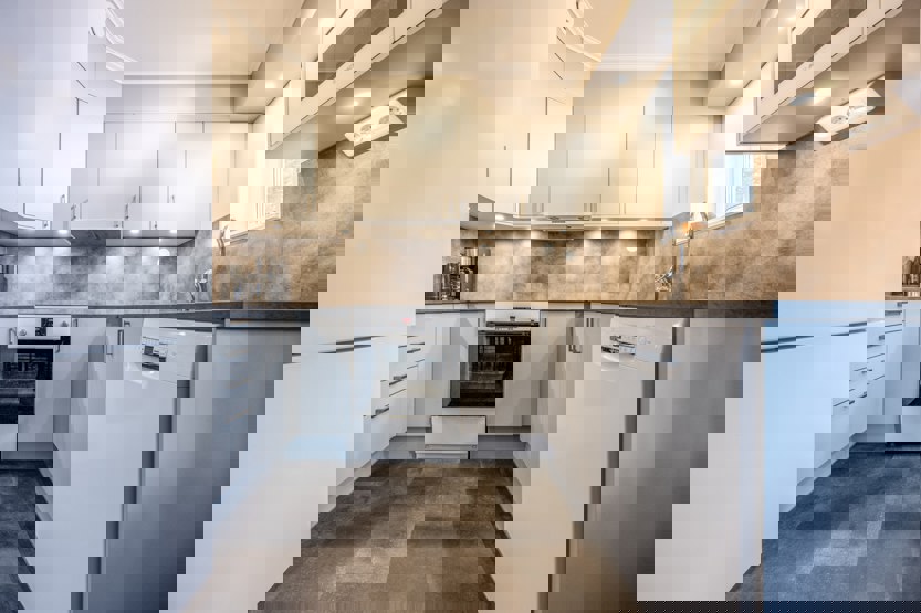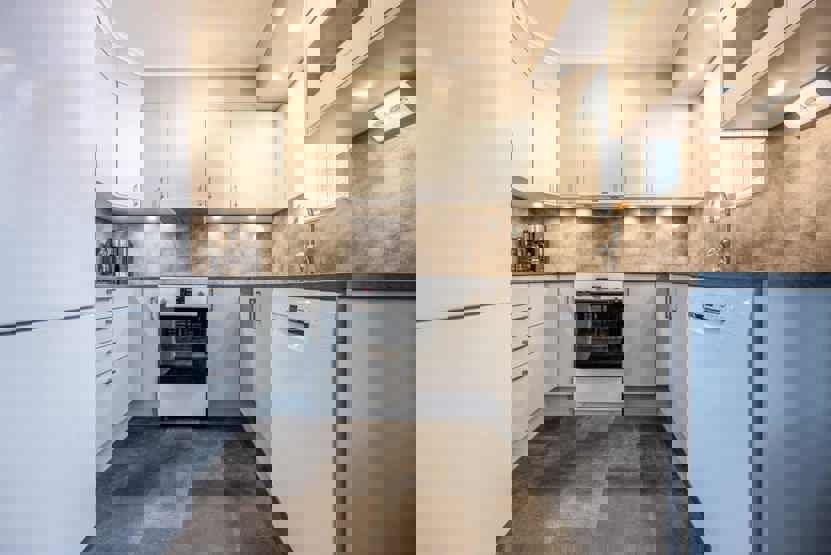 Køkkenet indeholder: elkomfur med ovn, køleskab, frys, opvaskemaskine, microovn.