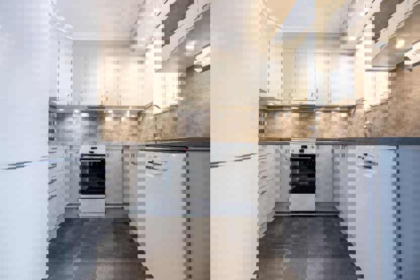 Køkkenet indeholder: elkomfur med ovn, køleskab, frys, opvaskemaskine, microovn.