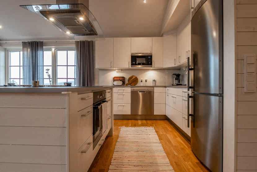Køkkenet indeholder: keramiske kogeplader med ovn, køleskab, frys, opvaskemaskine, microovn.