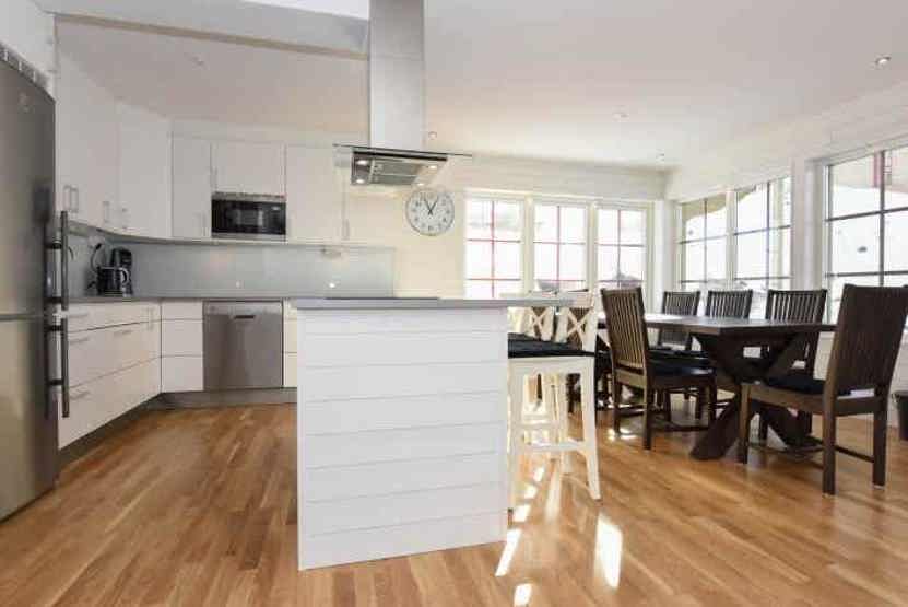 Køkkenet indeholder: keramiske kogeplader med ovn, køleskab, frys, opvaskemaskine, microovn.