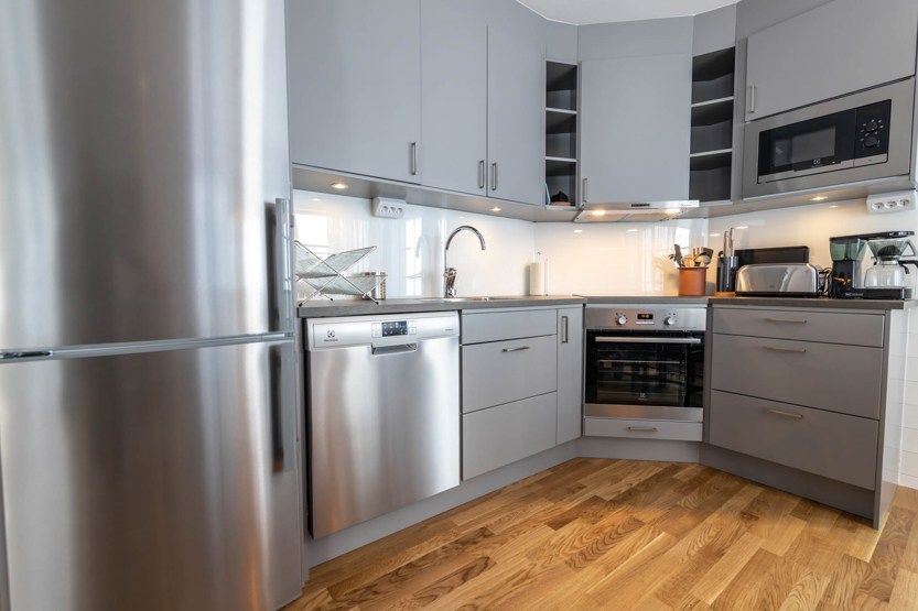 Køkkenet indeholder: keramiske kogeplader, indbygningsovn, køleskab, frys, opvaskemaskine, microovn.