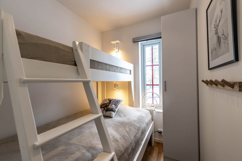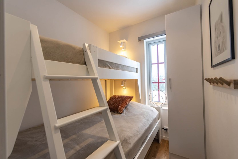 Soveværelse-1= 1 dobbeltseng 160 cm bred. Soveværelse-2= 1 køyeseng med 120 cm bred underkøye og 80 cm bred overkøye. Soveværelse-3= 1 køyeseng med 120 cm bred underkøye og 80 cm bred overkøye.