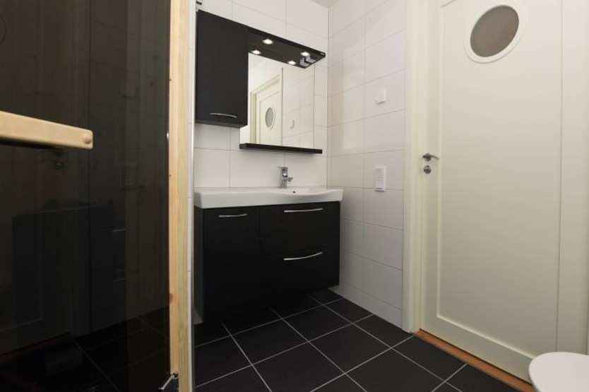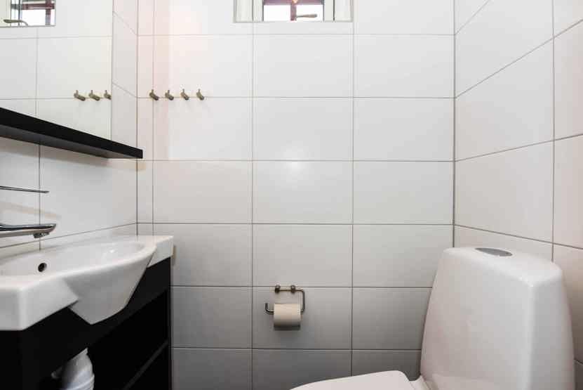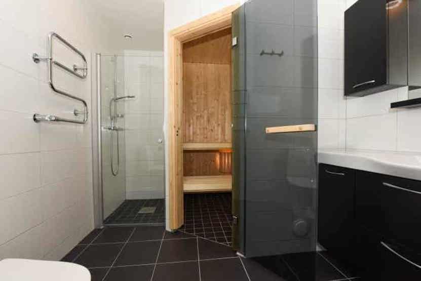 Badeværelset-1 = bruse/wc/sauna. Badeværelset-2 = wc.