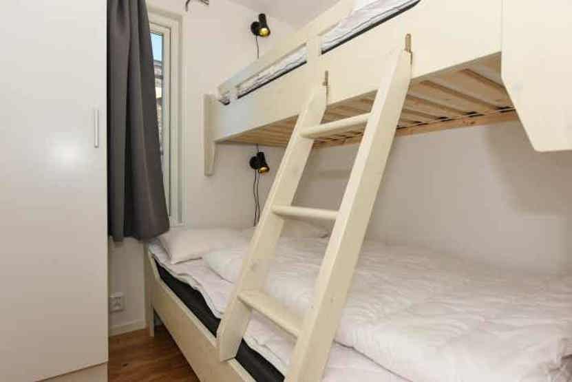 Soveværelse-1= 1 dobbeltseng. Soveværelse-2= 1 køjeseng med 120 cm bred underkøje . Soveværelse-3= 1 køjeseng med 120 cm bred underkøje .