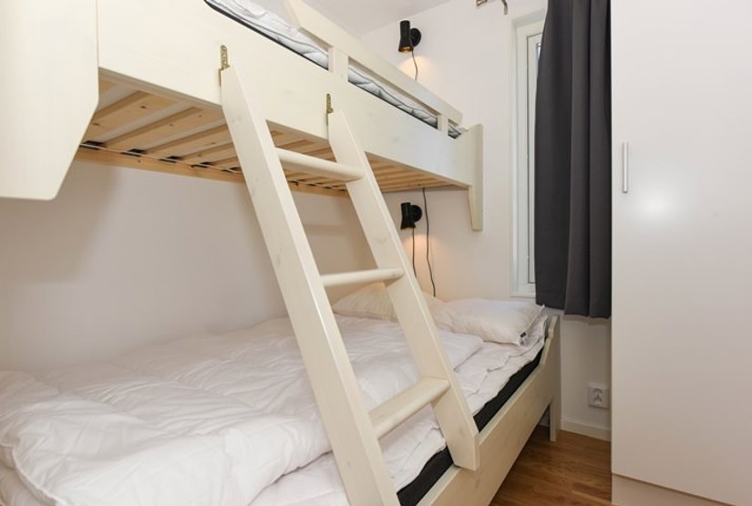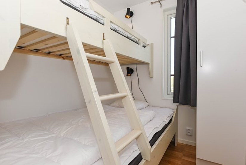 Soveværelse-1= 1 dobbeltseng. Soveværelse-2= 1 køjeseng med 120 cm bred underkøje . Soveværelse-3= 1 køjeseng med 120 cm bred underkøje .