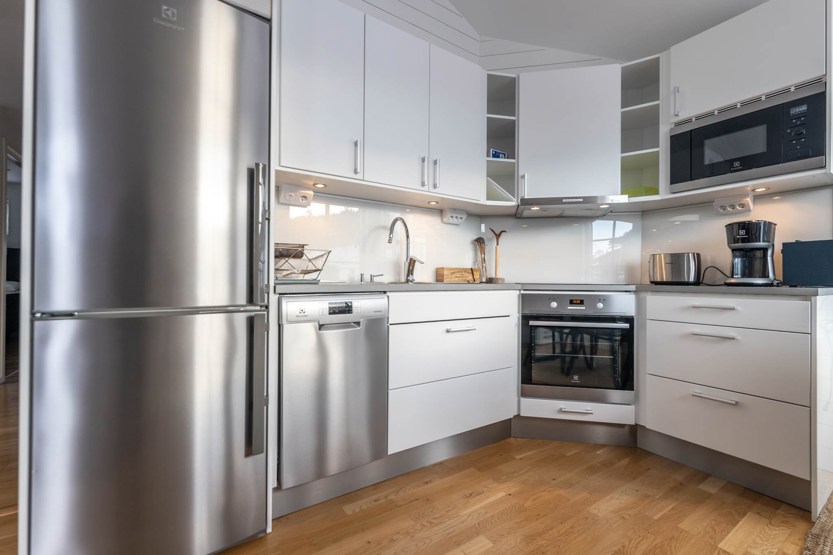 Køkkenet indeholder: Kogeplade med induktion, indbygningsovn, køleskab, frys, opvaskemaskine, microovn.