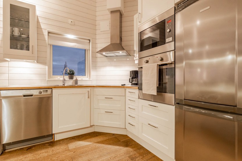 Køkkenet indeholder: keramiske kogeplader med ovn, køleskab, frys, opvaskemaskine, microovn.