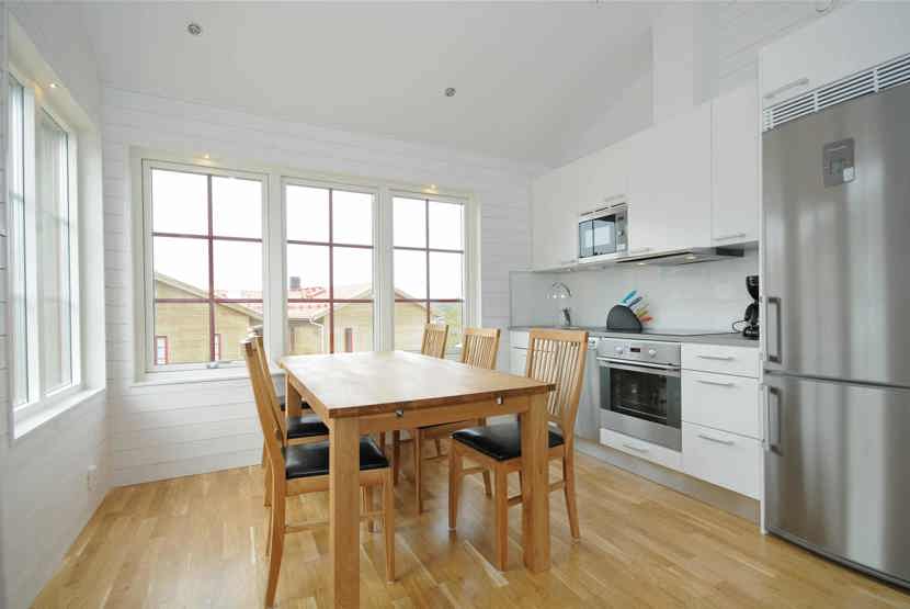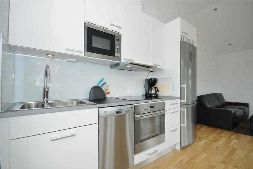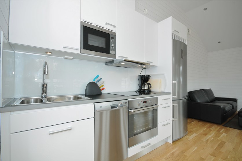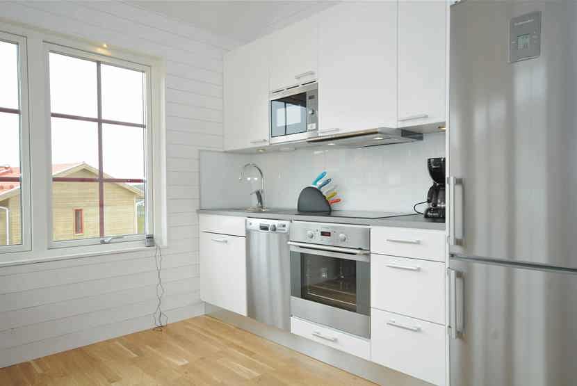 Køkkenet indeholder: keramiske kogeplader med ovn, køleskab, frys, opvaskemaskine, microovn.