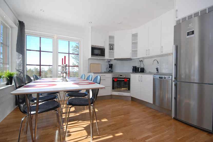 Køkkenet indeholder: keramiske kogeplader med ovn, køleskab, frys, opvaskemaskine, microovn.