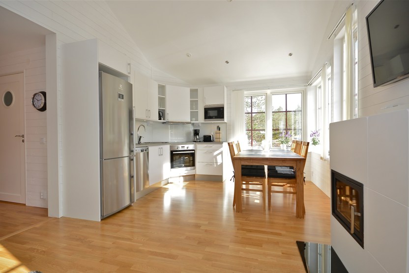 Køkkenet indeholder: keramiske kogeplader med ovn, køleskab, frys, opvaskemaskine, microovn.