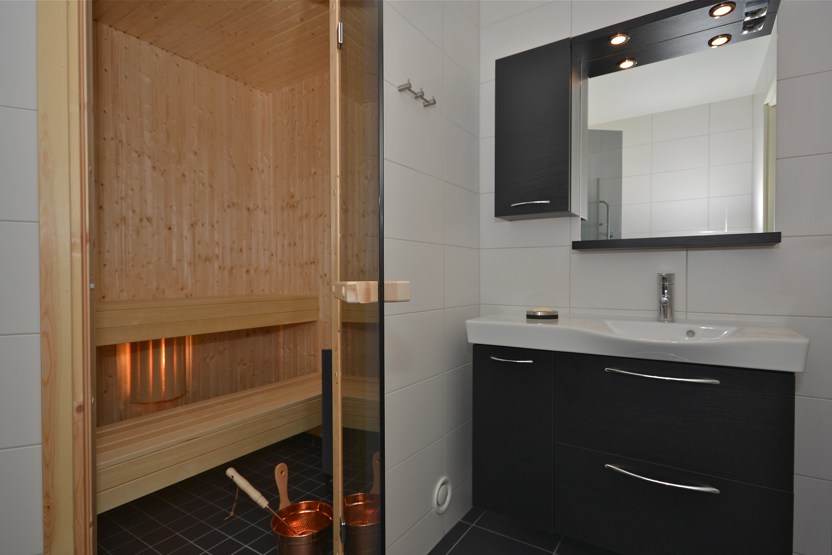 Badeværelset-1 = bruse/wc/sauna. Badeværelset-2 = wc.