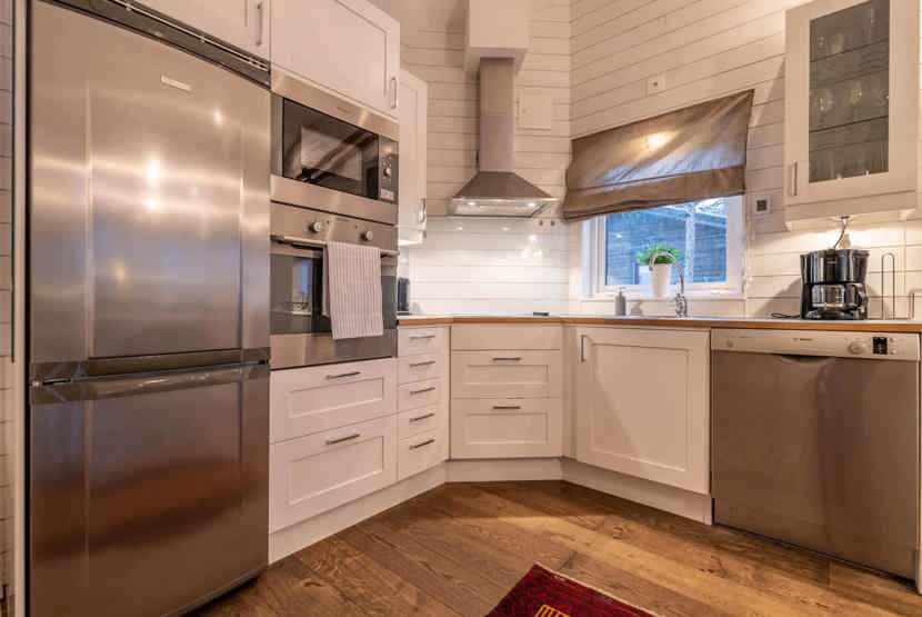 Køkkenet indeholder: keramiske kogeplader med ovn, køleskab, frys, opvaskemaskine, microovn.