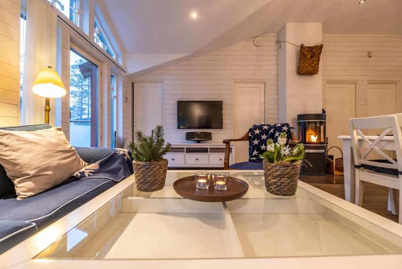 Opholdsstue med køkkenafdeling. TV, tørreskab, brændeovn (brænde indgår ikke), vaskemaskine, skistøvletører, rum til skiudstyr, (balkonen må ikke anvendes).