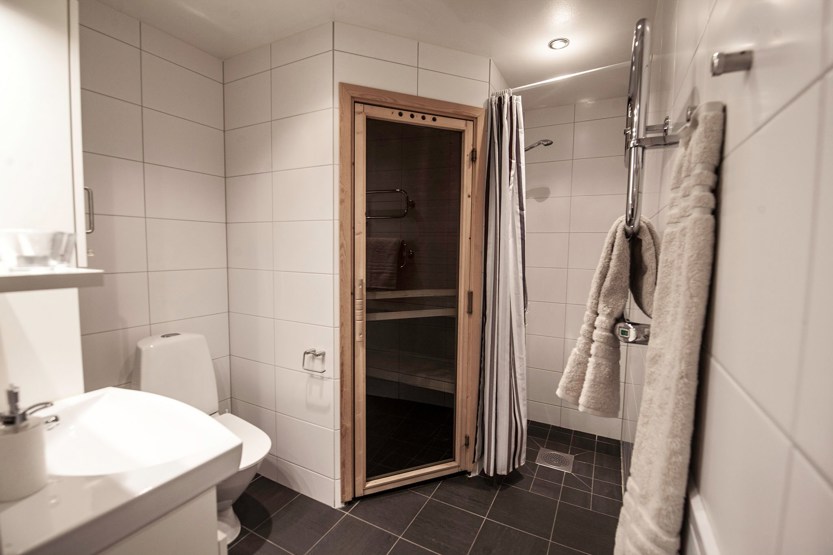 Badeværelset-1 = bruse/wc/sauna. Badeværelset-2 = bruse/wc.