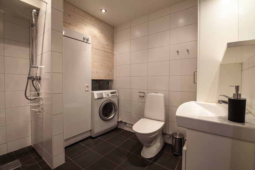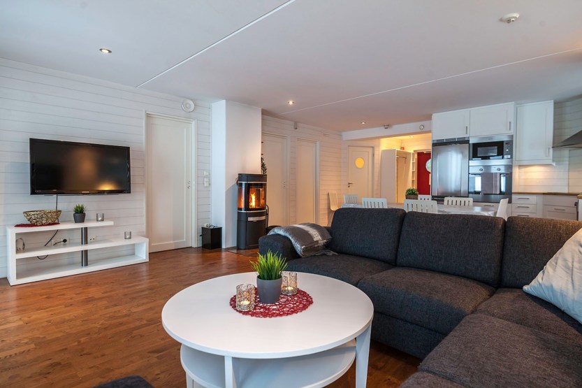 Opholdsstue med køkkenafdeling. TV, tørreskab, brændeovn (brænde indgår ikke), vaskemaskine, rum til skiudstyr.
