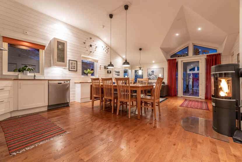 Opholdsstue med køkkenafdeling. TV, tørreskab, brændeovn (brænde indgår ikke), vaskemaskine, skistøvletører, rum til skiudstyr, (balkonen må ikke anvendes).