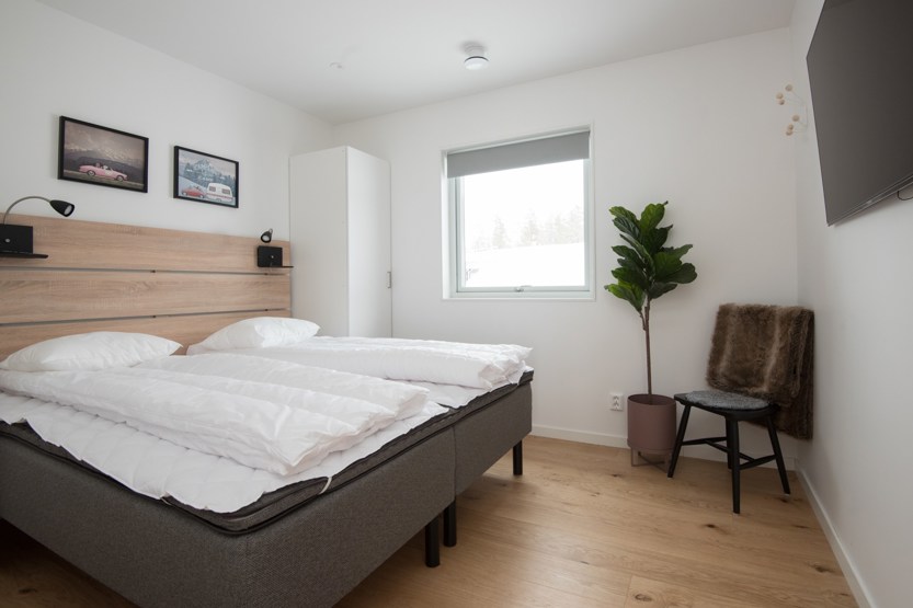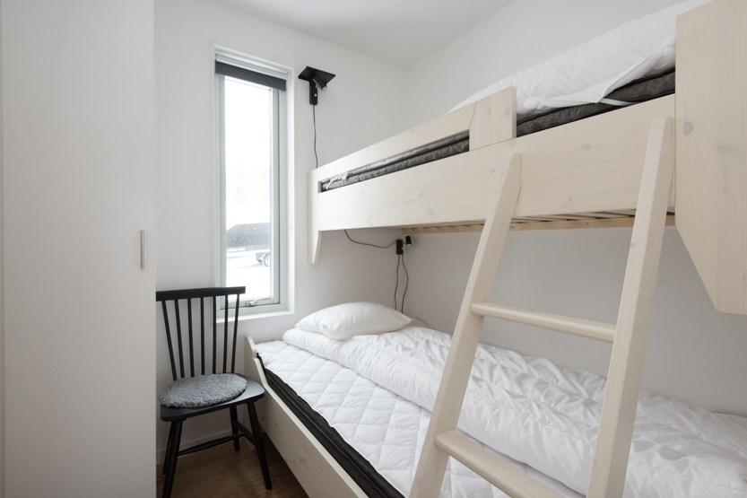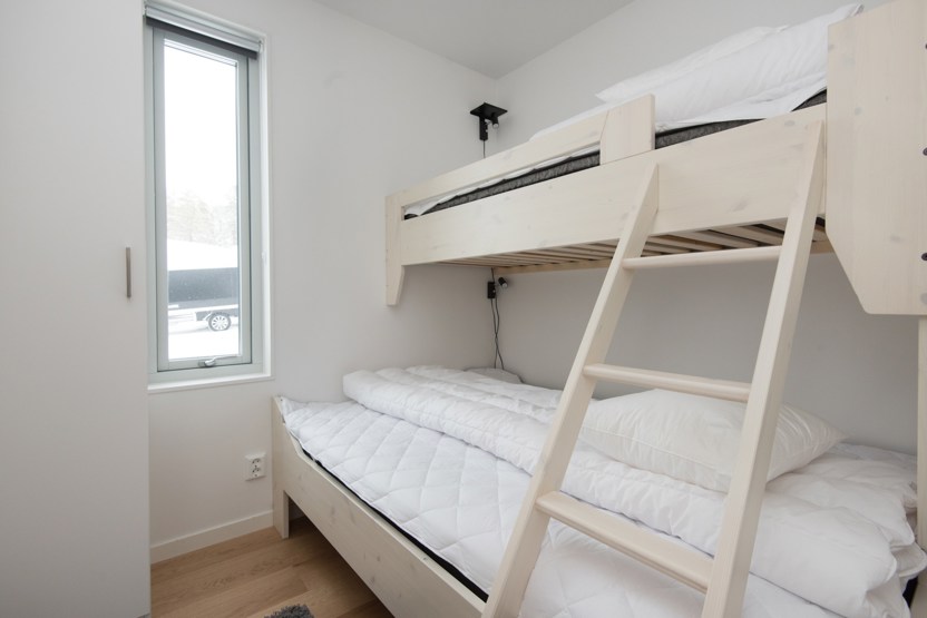 Soveværelse-1= 1 dobbeltseng 180 cm bred. Soveværelse-2= 1 køyeseng med 140 cm bred underkøye og 80 cm bred overkøye. Soveværelse-3= 1 køyeseng med 120 cm bred underkøye og 80 cm bred overkøye.