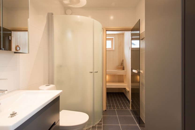 Badeværelset-1 = bruse/wc/sauna. Badeværelset-2 = wc.