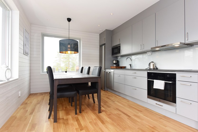 Køkkenet indeholder: keramiske kogeplader, indbygningsovn, køleskab, frys, opvaskemaskine, microovn.