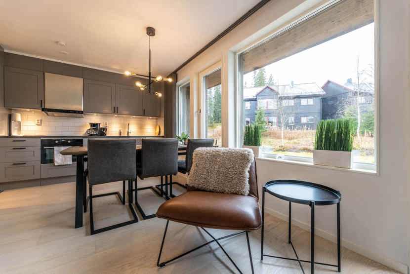 Opholdsstue med køkkenafdeling. TV, vaskemaskine, tørreskab, altan (skovles ikke), rum til skiudstyr.