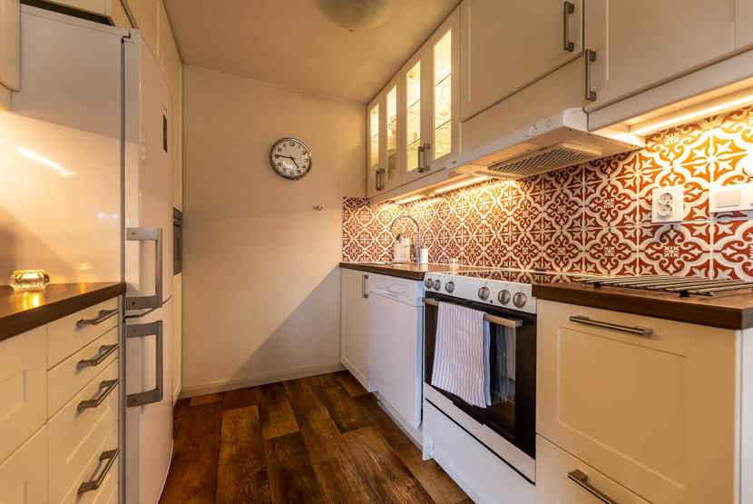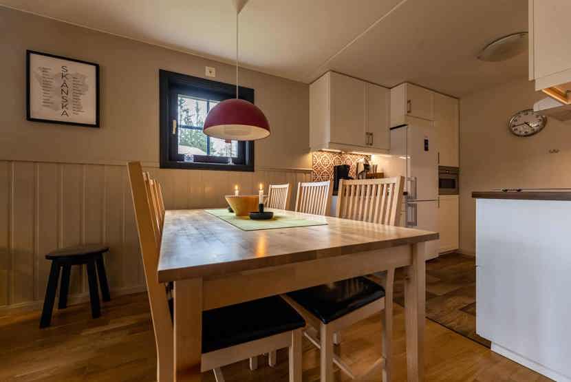 Køkkenet indeholder: keramiske kogeplader med ovn, køleskab, frys, opvaskemaskine, microovn.