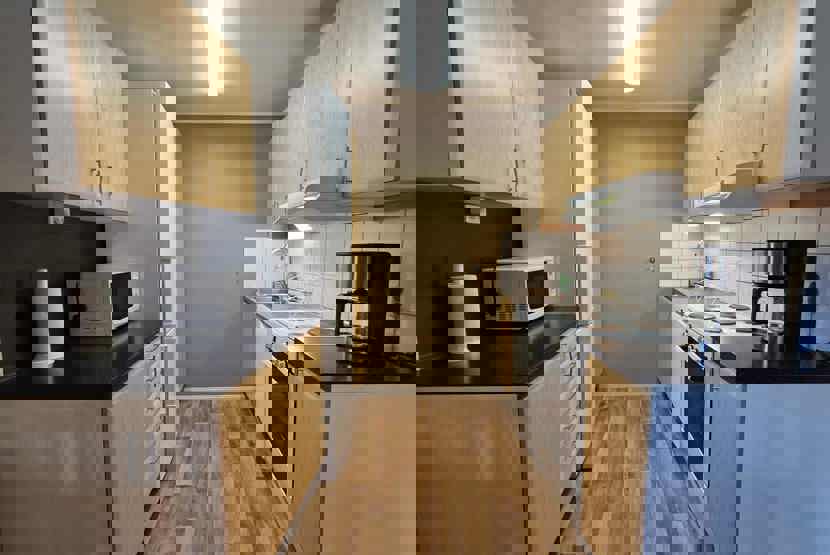 Køkkenet indeholder: elkomfur med ovn, microovn, opvaskemaskine, køleskab, frys.
