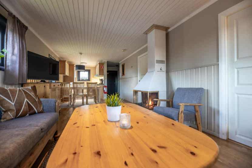 Opholdsstue med køkkenafdeling. TV, brændeovn (brænde indgår ikke), tørreskab, rum til skiudstyr, balkon, 1 parkeringsplads.