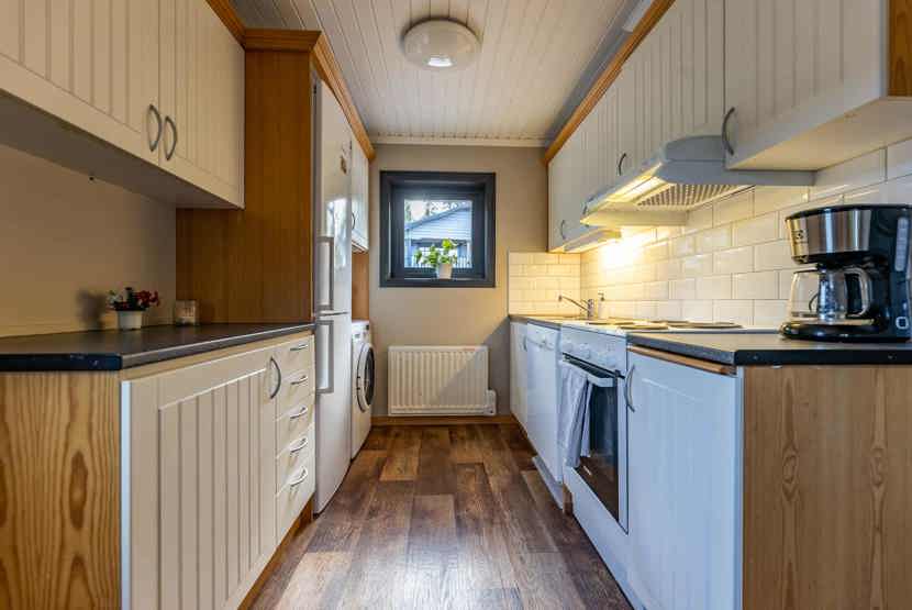 Køkkenet indeholder: elkomfur med ovn, microovn, opvaskemaskine, køleskab, frys.