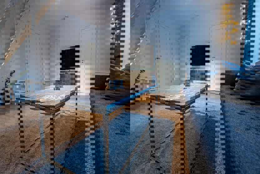 Opholdsstue med køkkenafdeling, og opholdsstue på øverste etage.
