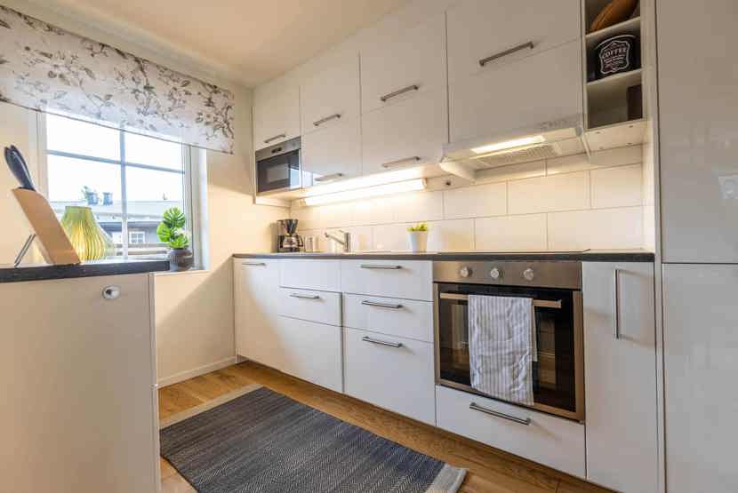 Køkkenet indeholder: keramiske kogeplader med ovn, køleskab, frys, opvaskemaskine, microovn.