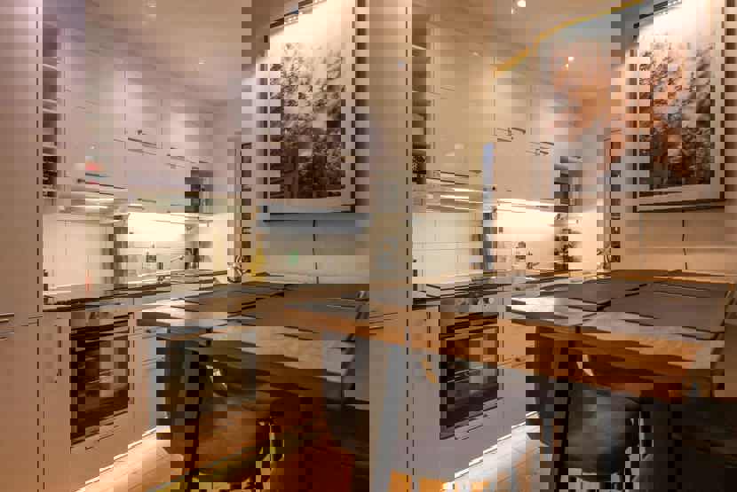 Køkkenet indeholder: keramiske kogeplader, ovn, køleskab, frys, opvaskemaskine, microovn.
