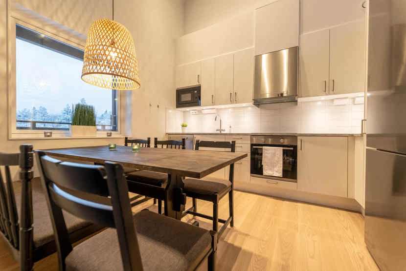 Køkkenet indeholder: elkomfur med ovn, køleskab, frys, opvaskemaskine, microovn.