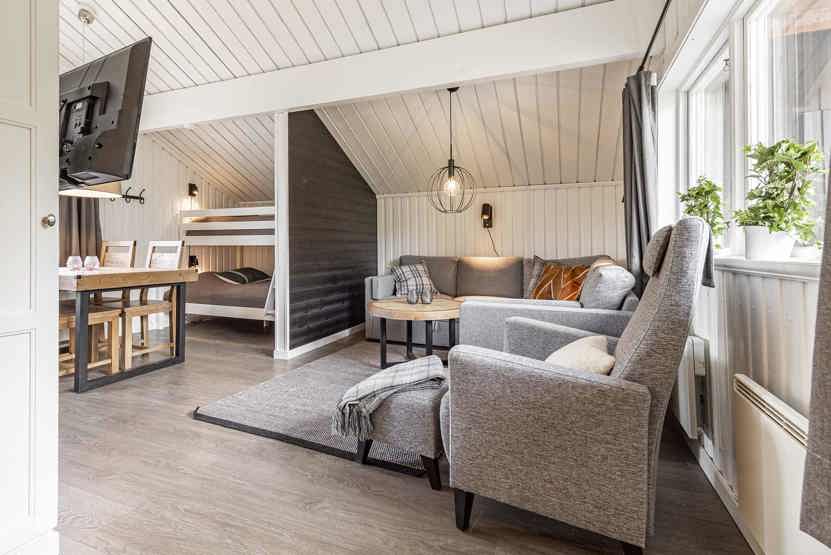 Opholdsstue med køkkenafdeling, sovesofa til 2 personer. TV, tørreskab, rum til skiudstyr, altan (skovles ikke), havem¢bler.