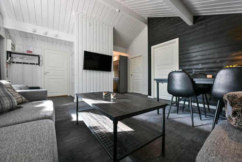 Opholdsstue med køkkenafdeling. TV, tørreskab, rum til skiudstyr, altan (skovles ikke).
