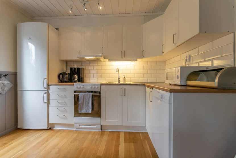 Køkkenet indeholder: elkomfur med ovn, køleskab, frys, opvaskemaskine, microovn.
