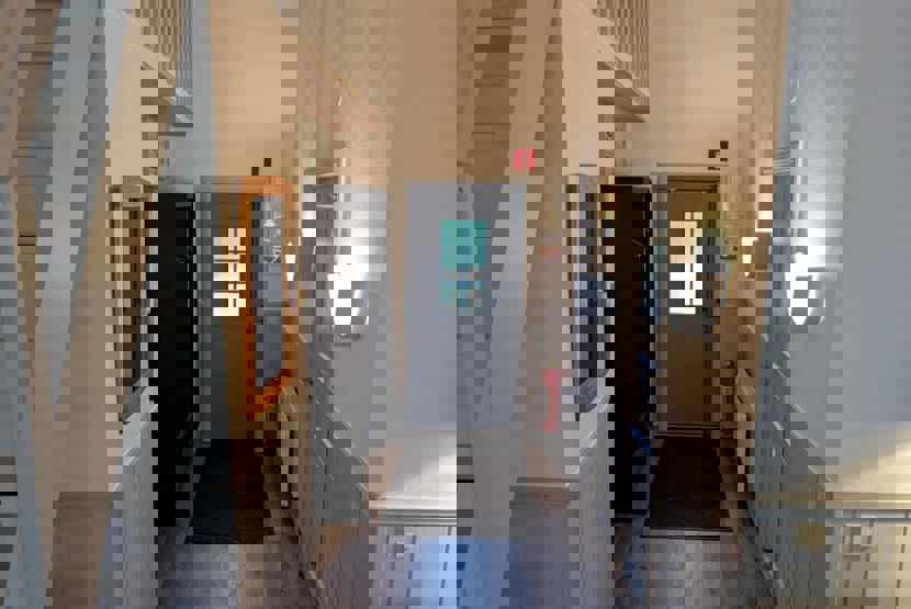 Køkkenet indeholder: elkomfur med ovn, køleskab, frys, opvaskemaskine, microovn.