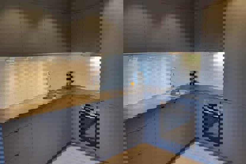 Køkkenet indeholder: elkomfur med ovn, køleskab, frys, opvaskemaskine.