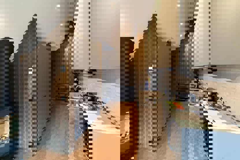 Køkkenet indeholder: elkomfur med ovn, køleskab, frys, opvaskemaskine, microovn.