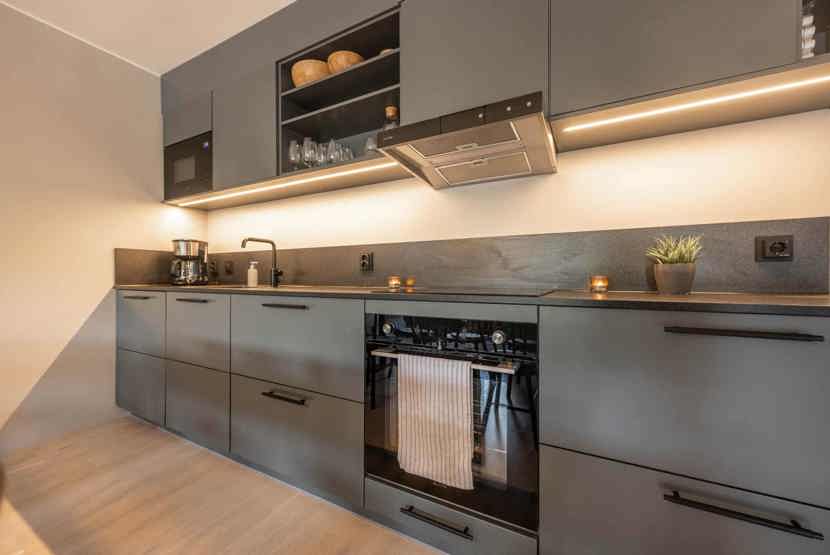 Køkkenet indeholder: elkomfur med ovn, køleskab med frostboks, opvaskemaskine, microovn.