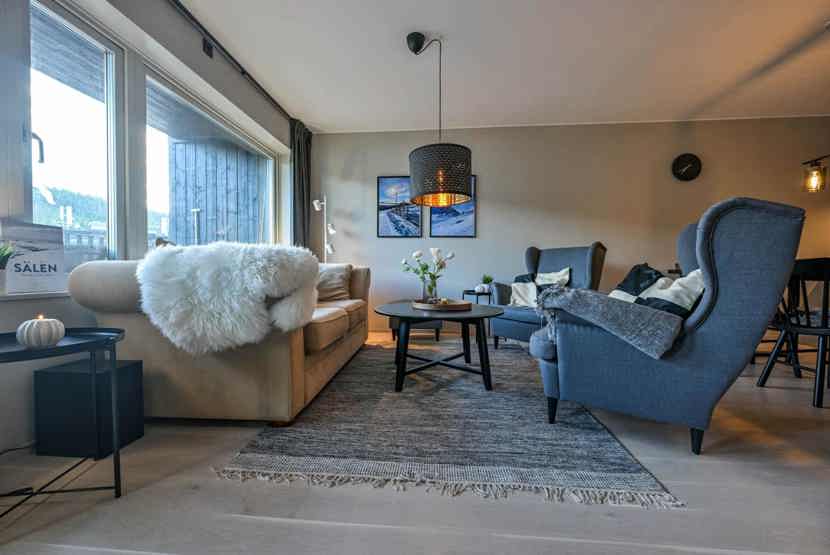 TV, balkon, I huset findes skiskabe med skistøvleopbevaring og elevator, 1 parkeringsplads.