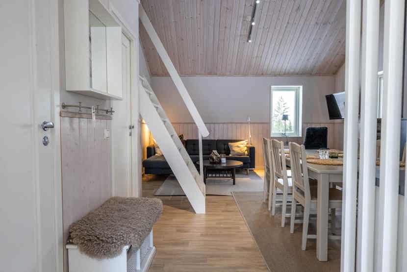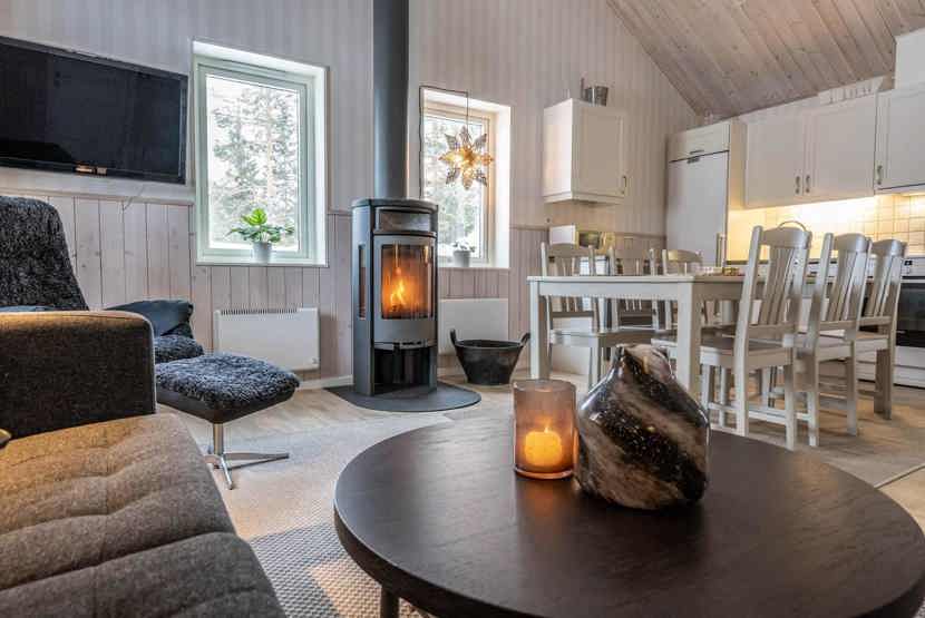 Opholdsstue med køkkenafdeling. TV, brændeovn (brænde indgår ikke), tørreskab, rum til skiudstyr.