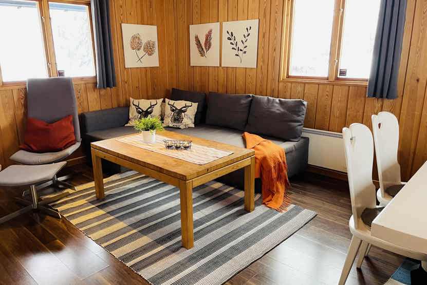 Opholdsstue med køkkenafdeling. TV, rum til skiudstyr, altan (skovles ikke).