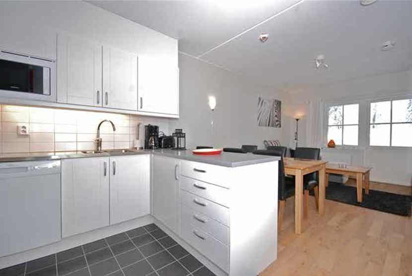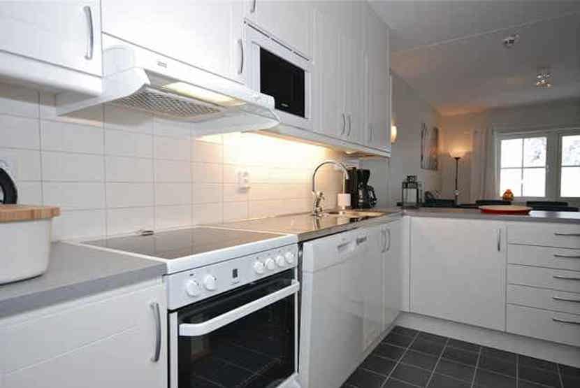 Køkkenet indeholder: keramiske kogeplader med ovn, køleskab, frys, opvaskemaskine, microovn.
