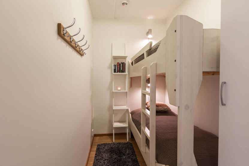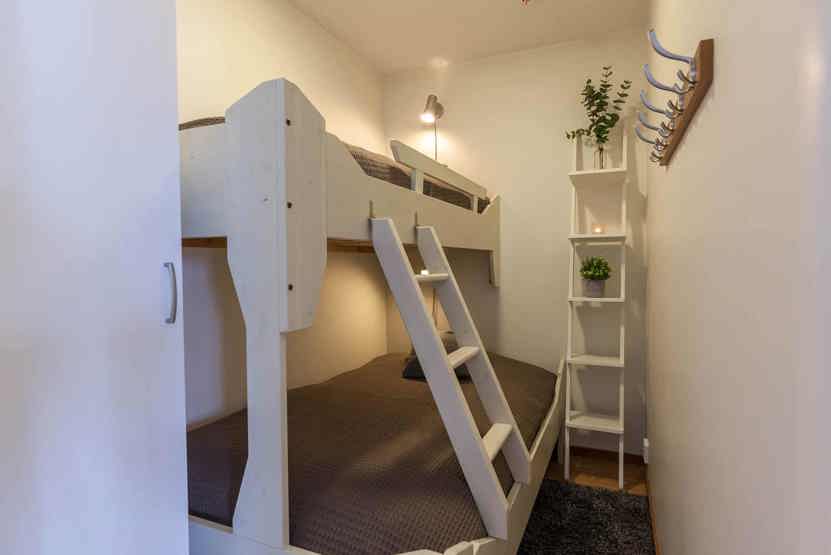 Soveværelse-1= 1 dobbeltseng. Soveværelse-2= 1 køjeseng. Soveværelse-3= 1 køjeseng. Soveværelse-4= 1 dobbeltseng. Soveværelse-5= 1 køyeseng med 120 cm bred underkøye og 90 cm bred overkøye.
