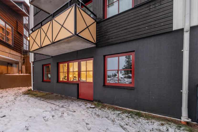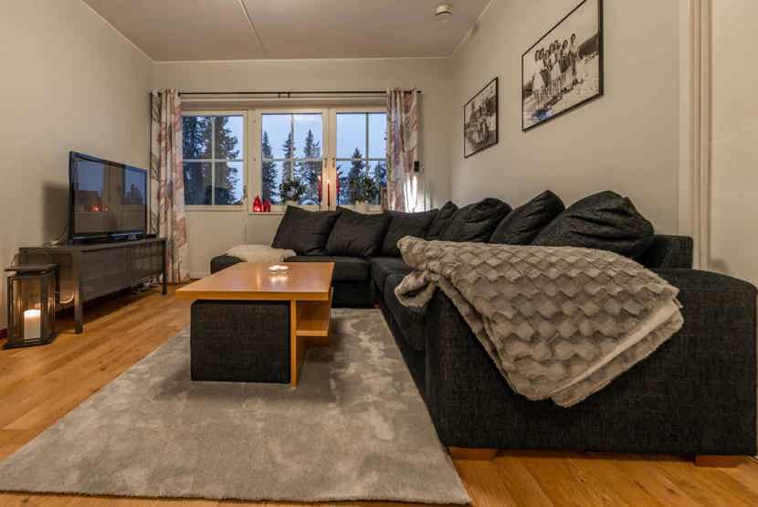 Opholdsstue med køkkenafdeling. TV, tørreskab, vaskemaskine, rum til skiudstyr, altan (skovles ikke).