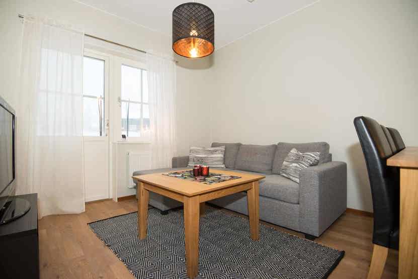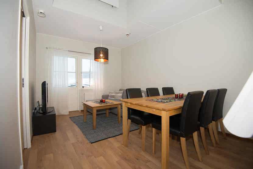 Opholdsstue med køkkenafdeling. TV, vaskemaskine, tørreskab, brandtrappe til hems, rum til skiudstyr, altan (skovles ikke).